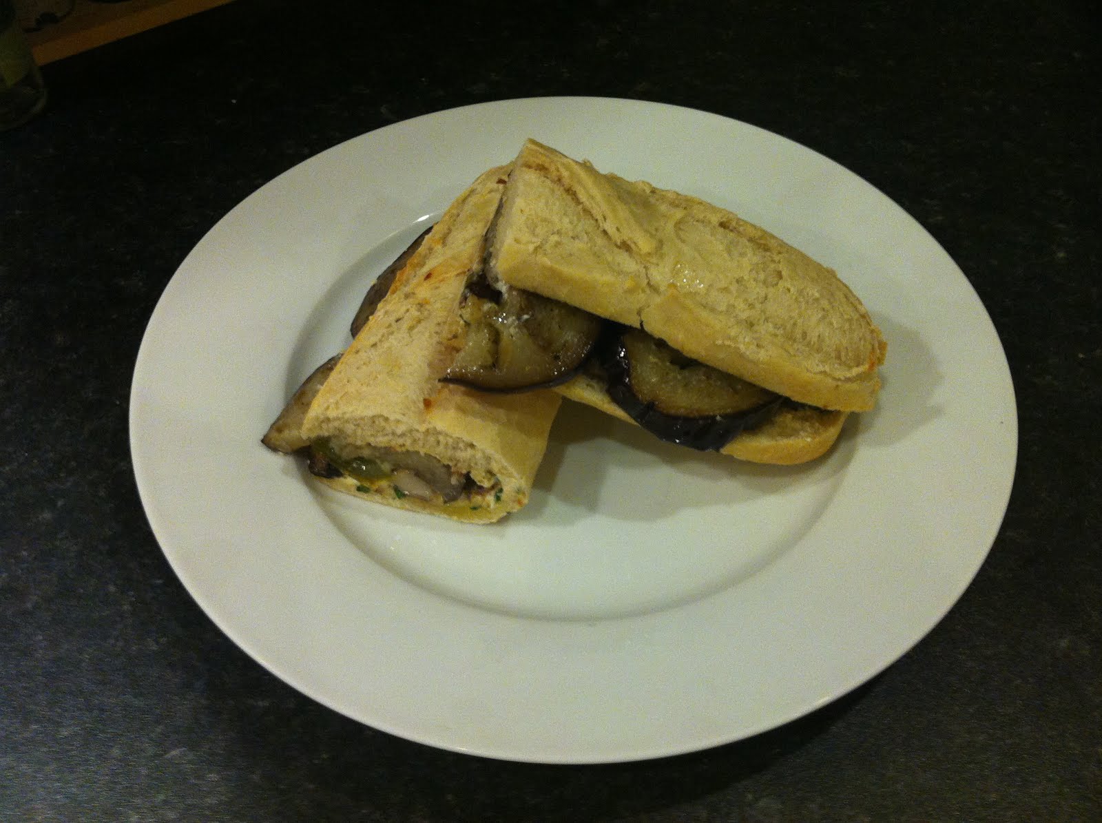 Bit of an unusual sandwich but it was absolutely delicious, really quick to make, and really set me up for the night! You can use the roasted aubergine slices you get vac-packed in olive oil from the world bit of the supermarkets, or you can just roast slices of it yourself- thick slices, drizzled with plenty of olive oil, salt and pepper, and chucked in the oven at 200C for about 10 minutes.